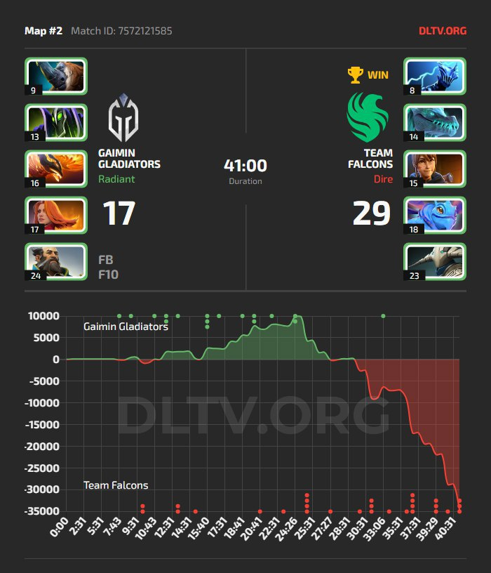 The second series of the day featured a banger matchup between the Gaimin Gladiators and Team Falcons. Surprisingly, thanks to an excellent performance on ATF’s Slardar, the Falcons could win the first game in 37 minutes, handing the Gladiators their first loss of the event.
