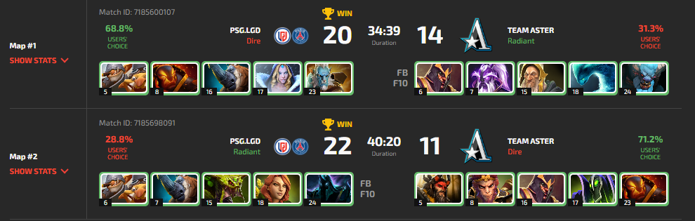 На первой карте PSG.LGD вязли Phantom Lancer для shiro на 23 пик, а Team Aster на 24 ответили Spirit Breaker в сложную. Первые 15 минут игры Team Aster удалось захватить небольшой перевес по золоту, но этого оказалось недостаточно. shiro дофармил Heart of Tarrasque и убить его Team Aster больше не могли. Spirit Breaker оказался плохим выбором и PSG.LGD начинают серию с победы.
