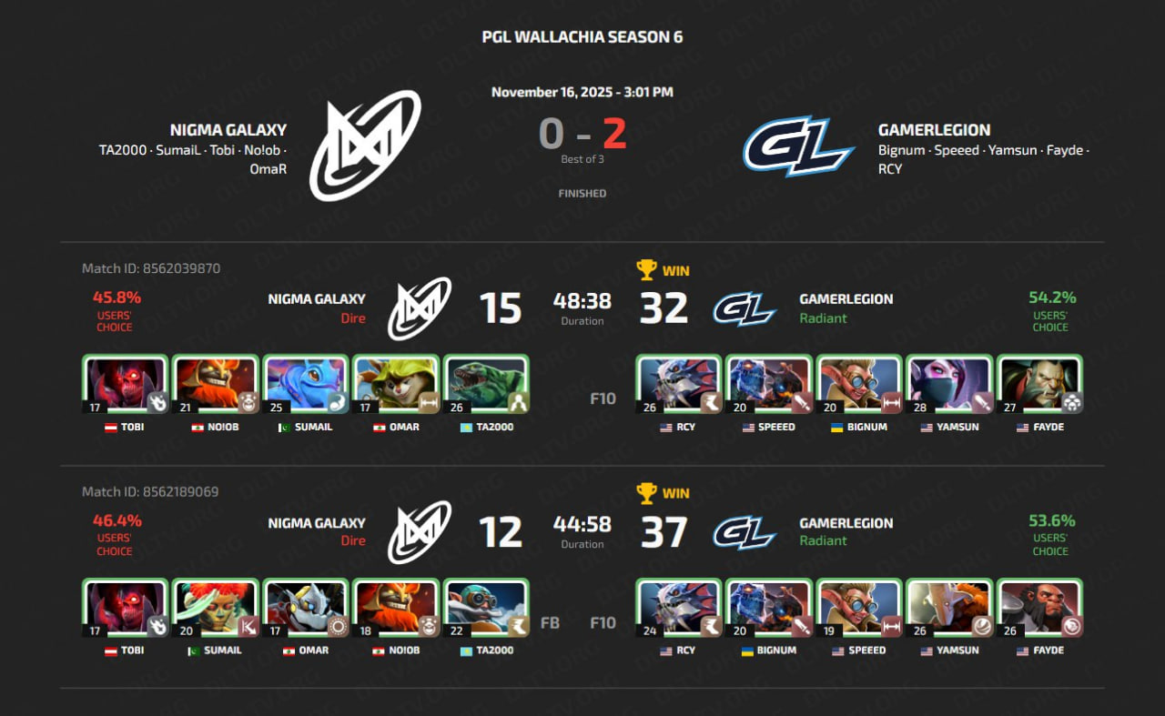 Nigma Galaxy dengan TA2000 kalah dari GamerLegion dan jatuh ke 0-2. Kedua peta ternyata mudah bagi GamerLegion. Perlu dicatat bahwa alasan kekalahan Nigma Galaxy bukan pada TA2000: di peta pertama dia harus bermain sebagai Tidehunter, tetapi bahkan pada hero carry yang tidak jelas ini dia menunjukkan performa yang baik, kalah dengan KDA 4/1/5.