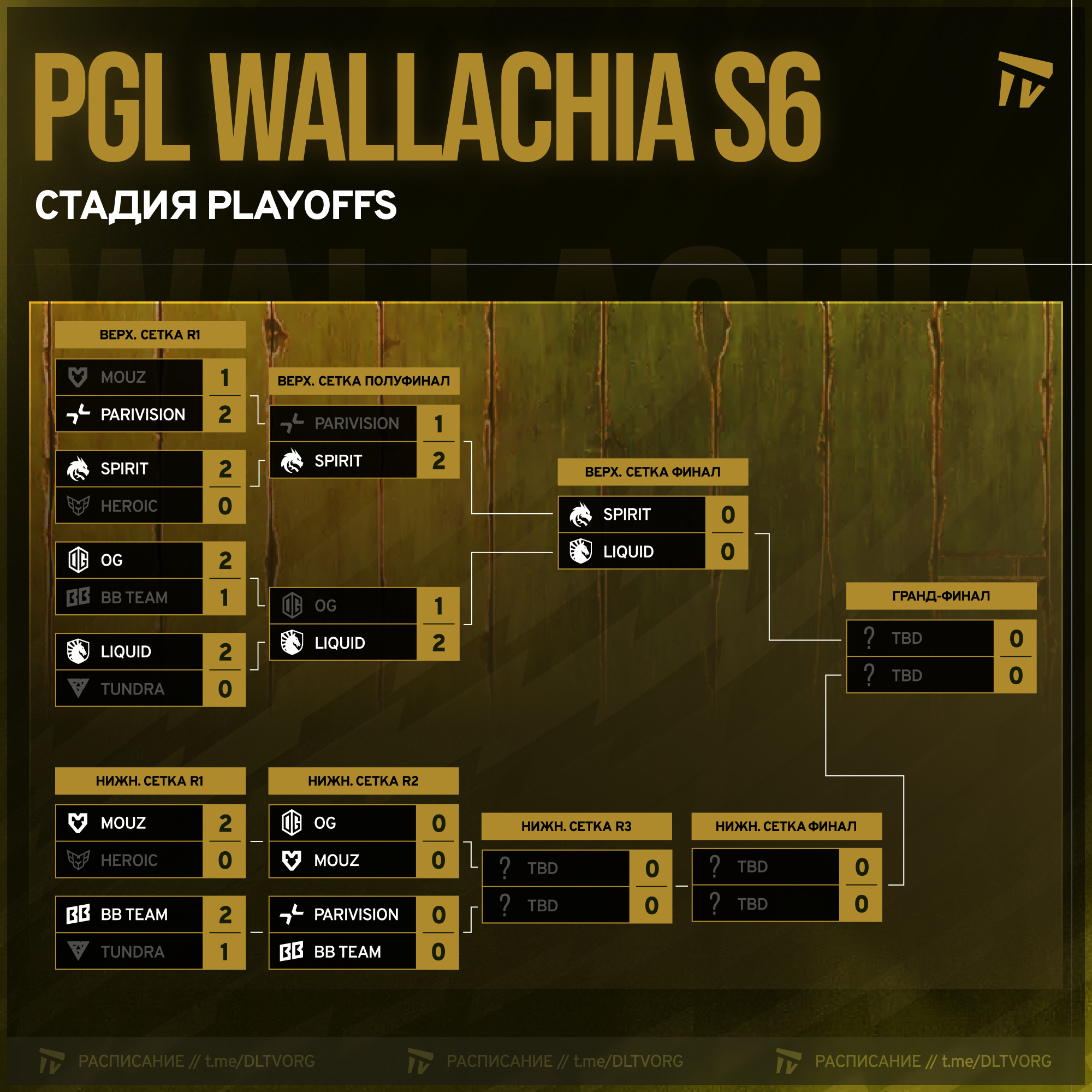 Hari kedua playoff PGL Wallachia Season 6 berakhir. Hasilnya, Team Spirit dan Team Liquid menunjukkan diri sebagai tim paling stabil dan lolos ke final upper bracket, OG dan PARIVISION jatuh ke lower bracket, sementara Heroic dan Tundra Esports meninggalkan turnamen. Mengenai BetBoom Team dan MOUZ, mereka melanjutkan penampilan mereka di lower bracket.