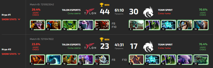 На первой карте Talon Esports сделали упор на темповый драфт. Они играли первым номером, навязывая драки своему оппоненту. “Драконы” же пытались затянуть игру в позднюю стадию, что у них и получилось. На 55 минуте Team Spirit быстрее отреагировали на появление Рошана, но Yatoro на Slark не смог вовремя отойти и потерял Аегис. Talon Esports сразу зафорсили его байбек, а в следующей драке бросили все силы на его убийство. Как итог - отсутствие выкупа у Slark, позволил южноазиатскому коллективу снести трон соперника - 1:0.