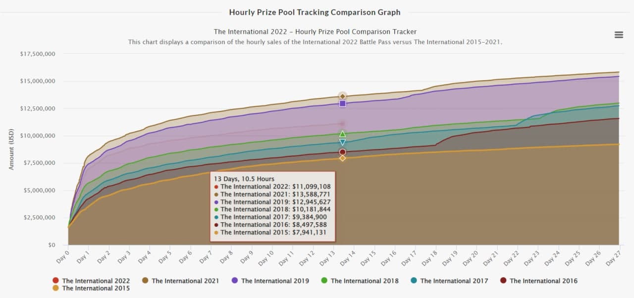 According to the Dota 2 Prize Pool Tracker website, the current The International is behind the previous 2 tournaments in the series in terms of prize pool growth. By this point, The International 2019 got $12,900,000 and The International 2021 achieved $13,500,000. It's also worth noting that the gap between the prize pool at The International 2018 is already less than $1,000,000.