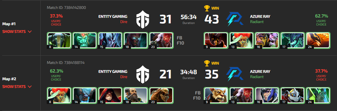 Azure Ray won all three lanes in the second game and snowballed their lead. However, they made a series of mistakes to give Entity a chance. Still, after killing watson's Lifestealer, who had no buyback, Azure Ray made a final push to end the game and win the series 2-0.